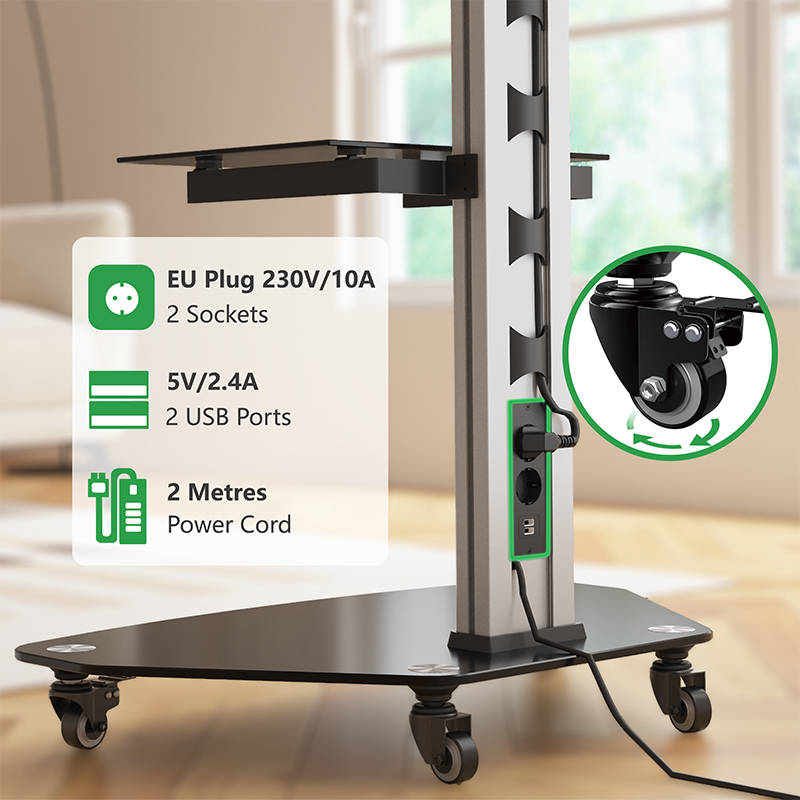 Deze stevige en stijlvolle vloerstandaard voor televisies is ideaal voor diverse toepassingen, waaronder presentaties, displays, en videoconferenties. Deze standaard is in hoogte verstelbaar en kan worden geroteerd om zowel horizontale als verticale weergave van uw presentatie mogelijk te maken. Bovendien is hij voorzien van wielen, waardoor hij geschikt is voor gebruik in diverse ruimtes, zoals bedrijfslobby’s, autoshowrooms, ziekenhuizen, hotellobby’s, vergaderruimten, beurspresentaties en nog veel meer. Dankzij de ingebouwde stroom- en USB-aansluitingen (5V) heeft u geen last meer van verlengkabels voor de tv of randapparatuur. Dit maakt de standaard ideaal voor het aansluiten van een laptop of gewoon het opladen van uw telefoon. Bovendien is hij eenvoudig te verplaatsen tussen vergaderruimten, wat zorgt voor optimaal gebruiksgemak. Kortom, een veelzijdige aanwinst voor elk bedrijf.